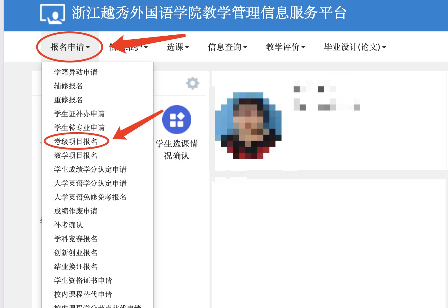 3.进入“教务管理系统”----“报名申请”栏----“考级项目报名”。