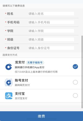 1.扫描下方二维码进入缴费界面(支持支付宝、建行手机银行)。